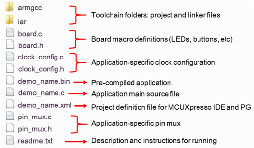 All files in the application folder are specific to that example, so it is easy to copy and paste an existing example to start developing a custom application based on a project provided in the MCUXpresso SDK.