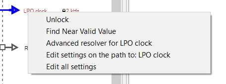 Edit settings on the path to: {clock output} – Invokes the floating view with the settings for all elements on the clock path leading to the selected clock output.