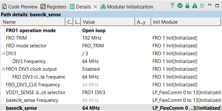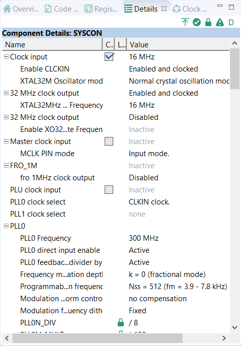The view contains a table with an expandable list of all clock initialization modules on the MCU in the current functional group. When the modules are expanded using the expand/collapse icon on the left, a list of all clock elements that are parts of the module is shown. Double-click to see the Details view, where the double-clicked element is focused and selected. This selection propagates to the clock diagram and other views.