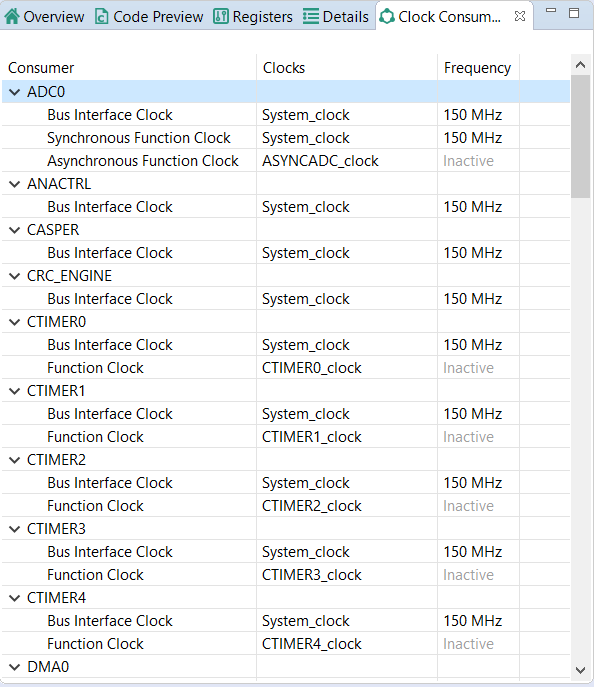 The Clock Consumers view provides an overview of peripheral instances. It also provides information on clock-clock instance pairing. This view is not editable and is for information only.