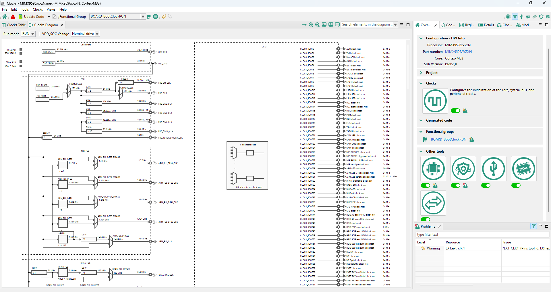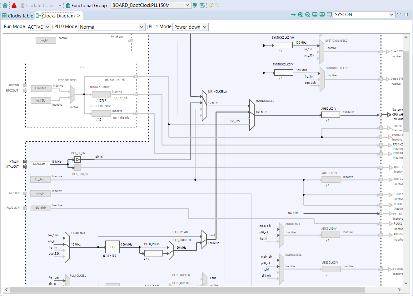 There can be one or more clock configurations handled by the Clocks tool. The default clock configuration is created with the name “BOARD_BootClockRUN”. Multiple configurations mean that multiple options are available for the processor initialization.
