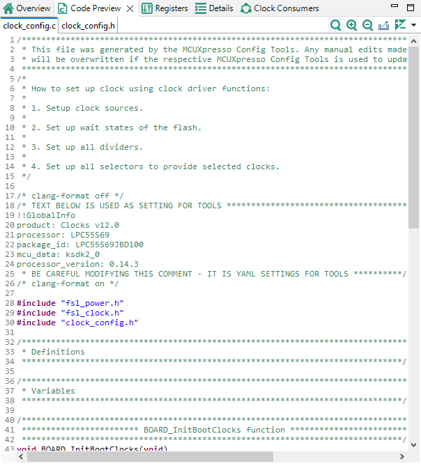 If the settings are correct and no error is reported, the tool’s code generation engine instantly regenerates the source code. The resulting code is found in the Code Preview view.