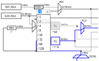 Each clock configuration (functional group) lists the settings for the entire clock system and is a part of the global configuration stored in the MEX file. Initially, after the new clock configuration is created, it is set to reflect the default after-reset state of the processor.