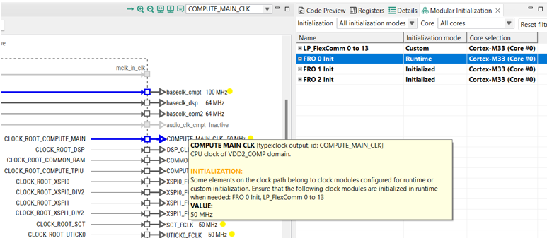 To alert the user of the potential of non-initialiazed clock output, a yellow marker is shown next to the affected clock output in the Clock Diagram. This marker highlights the clock elements on the path to the marked clock output belonging to a clock module in a non-default initialization mode (runtime or custom). The tooltip of that clock output displays information about the initialization modules that are in the nondefault initialization state. This feature can be seen in Yellow marker in clock diagram informing about nondefault initialization mode.