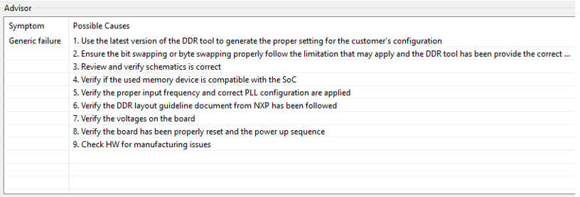 If a test fails, the Summary view in the Advisor section displays Symptom and Possible Causes to provide high-level guidance on the debug process when looking for possible DDR subsystem issues.