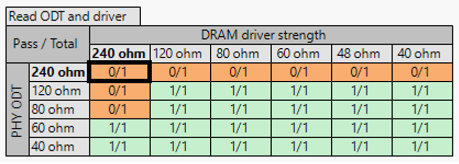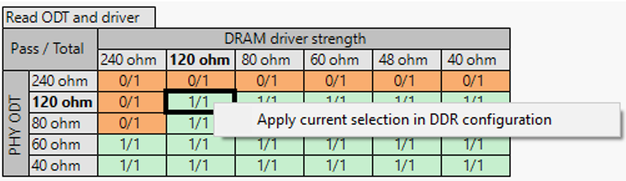For passing cells (Green cells), the option Apply current selection in DDR configuration (right-click on the cell) is enabled. It sets the respective Driver Strength and ODT value into the configuration for use in other scenarios.