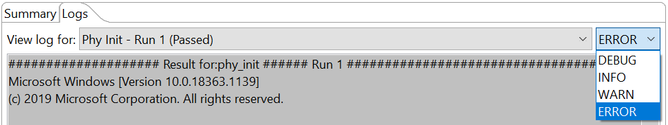 To start test execution, press the “Start Validation” button. You can check the status of the running test from the Logsconsole. By default, the log level is set to ERROR. Additional log-level options are available, with different output in the console: