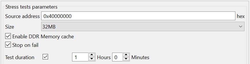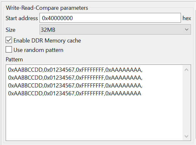 Operational – performs basic memory access test by running Write-Read-Compare/ Walking Ones/ Walking Zeros tests. Such options as Start Address, Size, Enable DDR Memory cache, Access mode/Pattern option are available for each test.