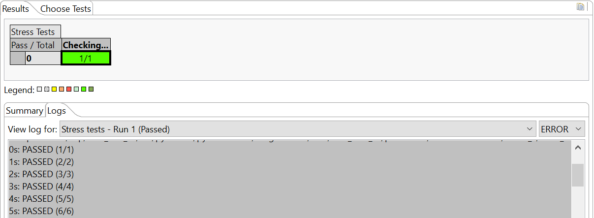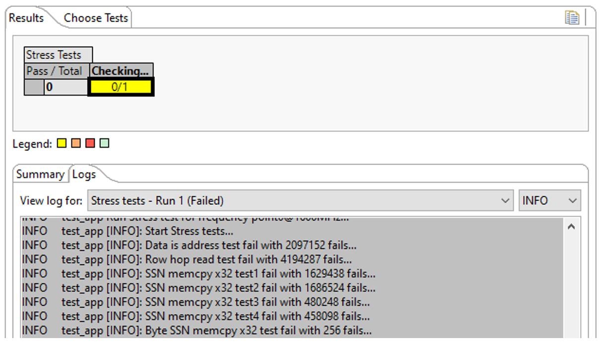 Single run runs the test suite one time with different options selected (Size, Enable DDR Memory cache, Stop on fail). In case of failure, you can check the status of each test in the suite in the Logs console, with Log level set to INFO