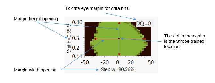 The x-axis data eye margin width opening is displayed as the percentage of one unit interval. For example: Step w=80.56 % of UI