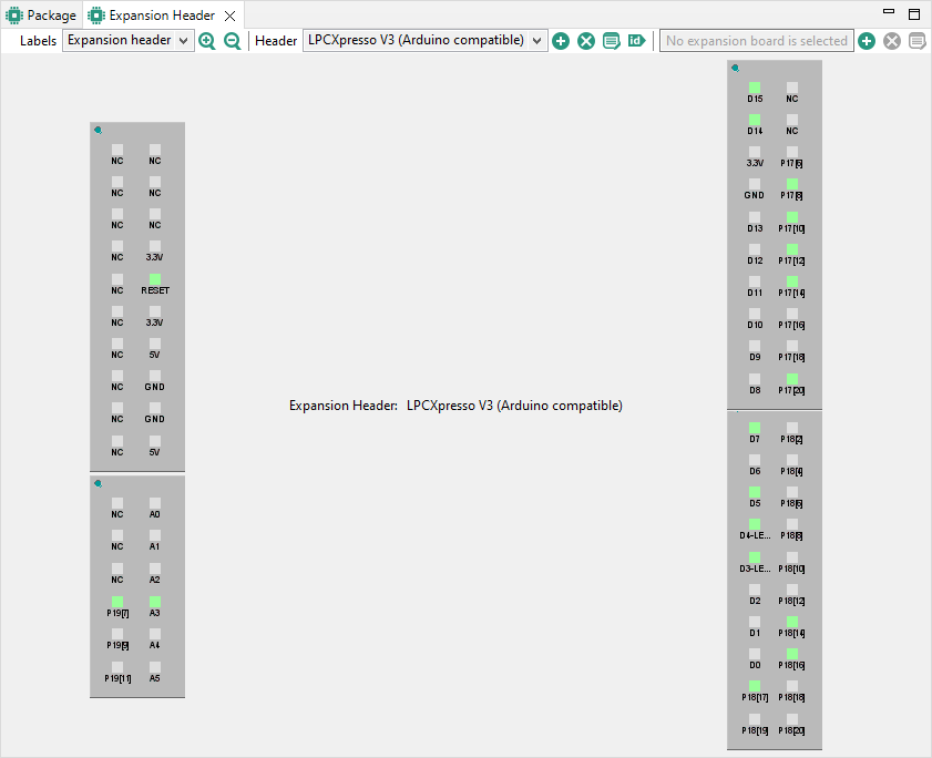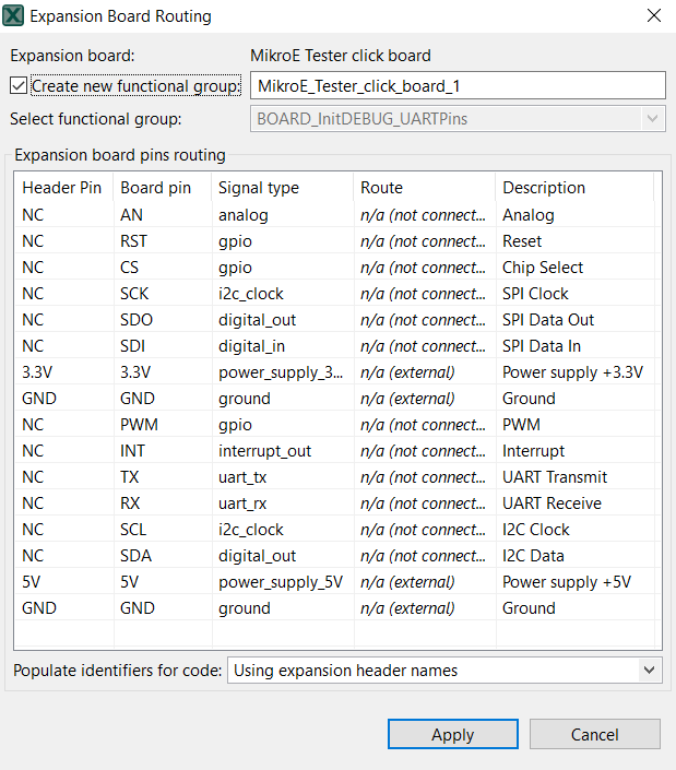 In the Expansion Header view, click the Apply expansion board to the selected header. Alternatively, select Pins > Apply expansion board from the Menu bar.