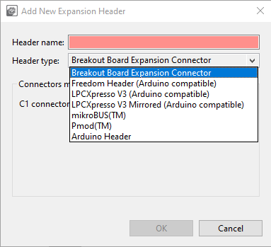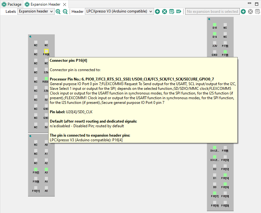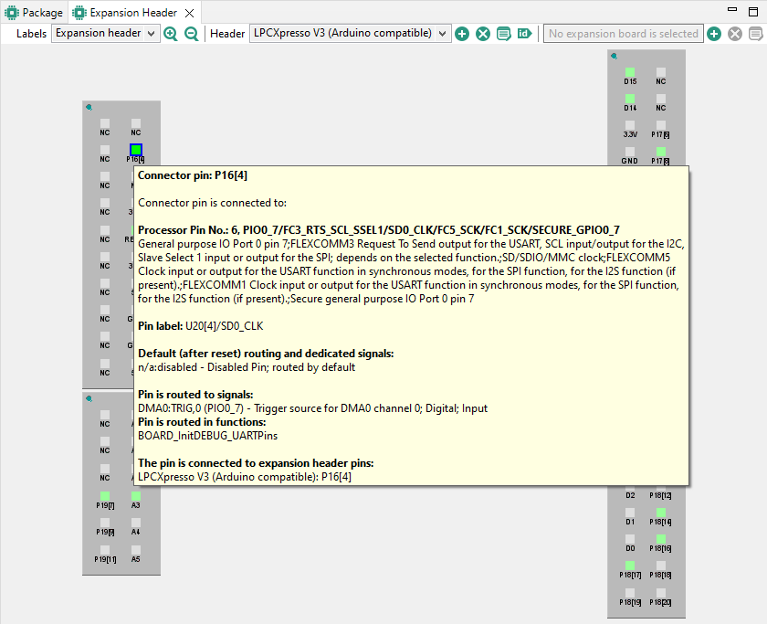 In the Expansion Header view, you can also apply an expansion board to an already created expansion header. The expansion board configuration can be imported into Pins tool in the form of an XML file. Based on the chosen processor, the tool will then recommend adequate routing.