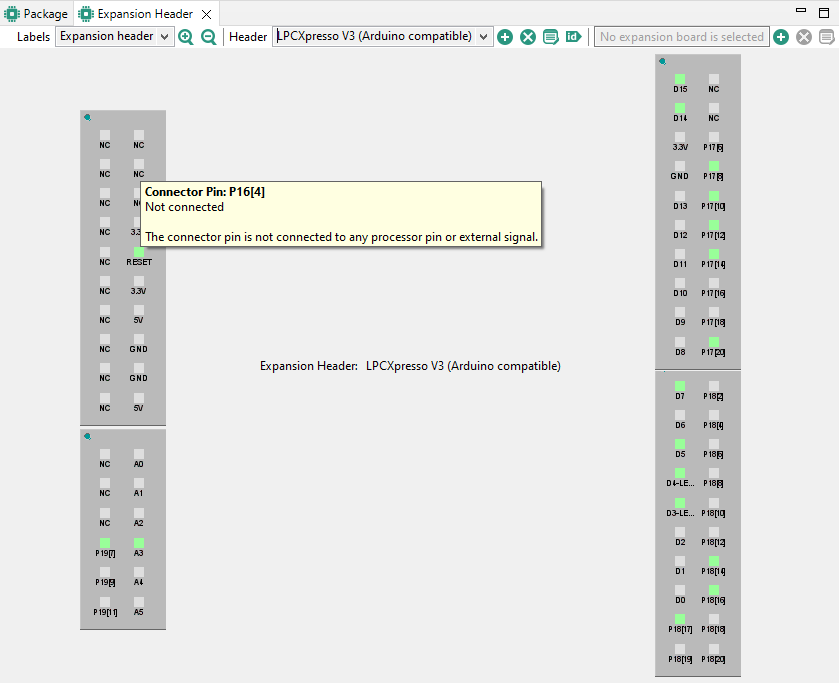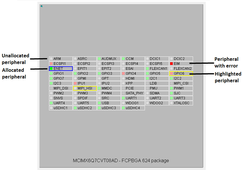 You can easily identify routed pins/peripherals in the package using highlighting. By default, the current selection (pin/peripheral) is highlighted in the Package view.