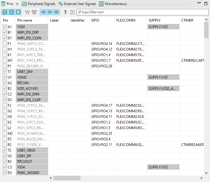 This view shows the list of all the pins available on a given device. The Pin name column shows the default name of the pin, or if the pin is routed. The next columns are optional. They are Label, Identifier, External User Signals and Expansion header connections (One column for each expansion header). The pin name is changed to show the appropriate function for the selected peripheral if routed. The next column of the table shows peripherals and signals and pin name(s) on a given peripheral. Peripherals with a few items are cumulated in the last column.