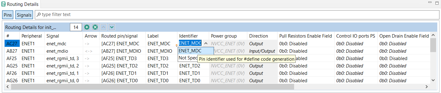In some cases, the default values are not reliable, as there may be code running before the application that modifies the pin configuration (for example, a bootloader). The option Full initialization of pins ensures that the initialization is fully done even for items that use after-reset state. This option is specific for each Functional group allowing to force full initialization of routing. Full initialization of pins is not enabled by default. When enabled, the electrical properties of existing routing are changed. The values in italics are changed to explicit values corresponding with them. When the option is disabled, the pins tool removes initialization of values that match the “No init” state.