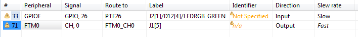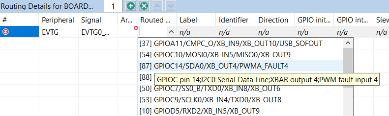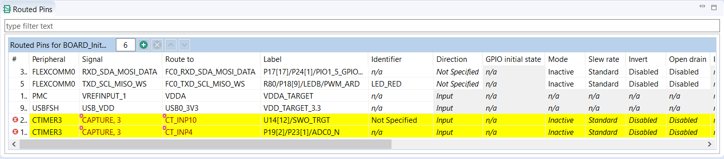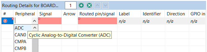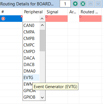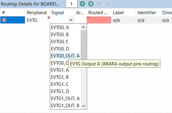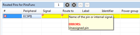 If an error or warning is encountered, the conflict in the Routing Details view is represented in the first column of the row and the error/warning is indicated in the cell, where the conflict was created. The last two rows in the figure above show the peripheral/signal where the erroneous configuration occurs. The detailed error/warning message appears as a tooltip.
