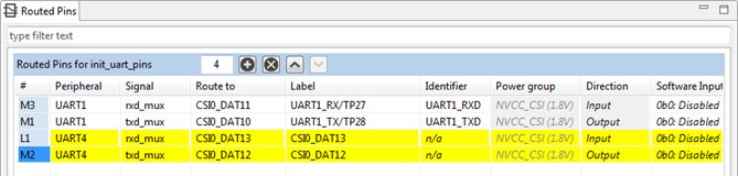 After the tool opens, the created configuration select functional group ‘init_uart_pins’ in the toolbar drop-down to show Routed Pins for it.