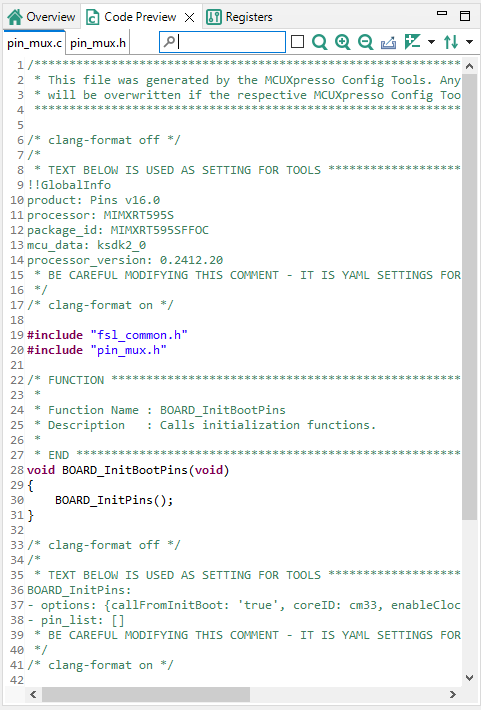 You can also copy and paste the generated code into the source files. The view generates code for each function. In addition to the function comments, the tool configuration is stored in a YAML format. This comment is not intended for direct editing and can be used later to restore the pins configuration.