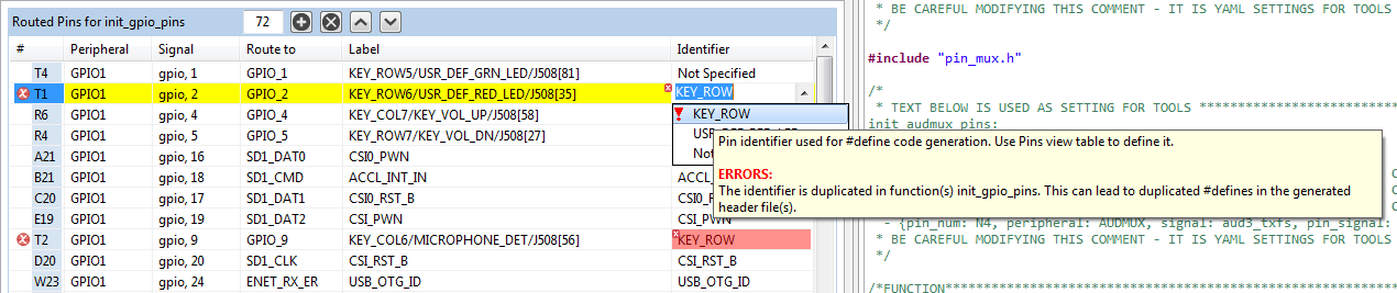 For example, when the LED_RED is specified an identifier of a pin routed to PTB22, the following defines are generated into the pin_mux.h: