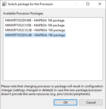 When multiple functions are specified in the configuration, the package view primarily shows the pins and the peripherals for the selected function. Pins and peripherals for different functions are shown with light transparency and cannot be configured, until switched to this function.