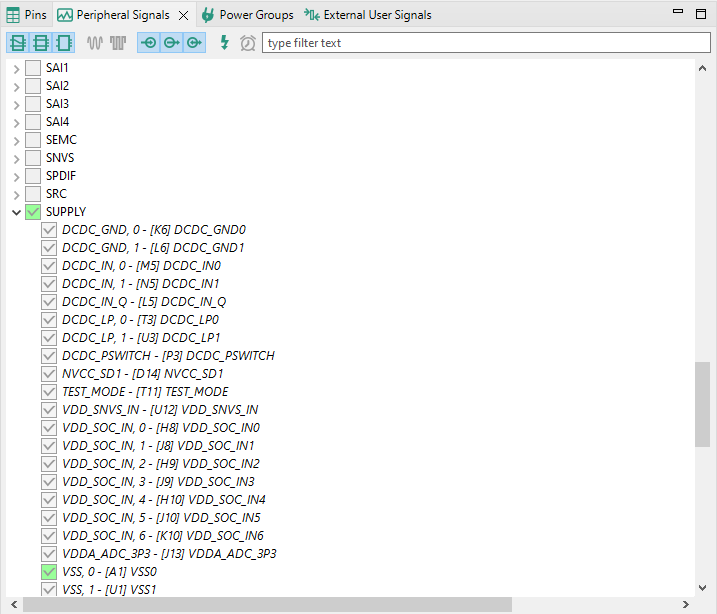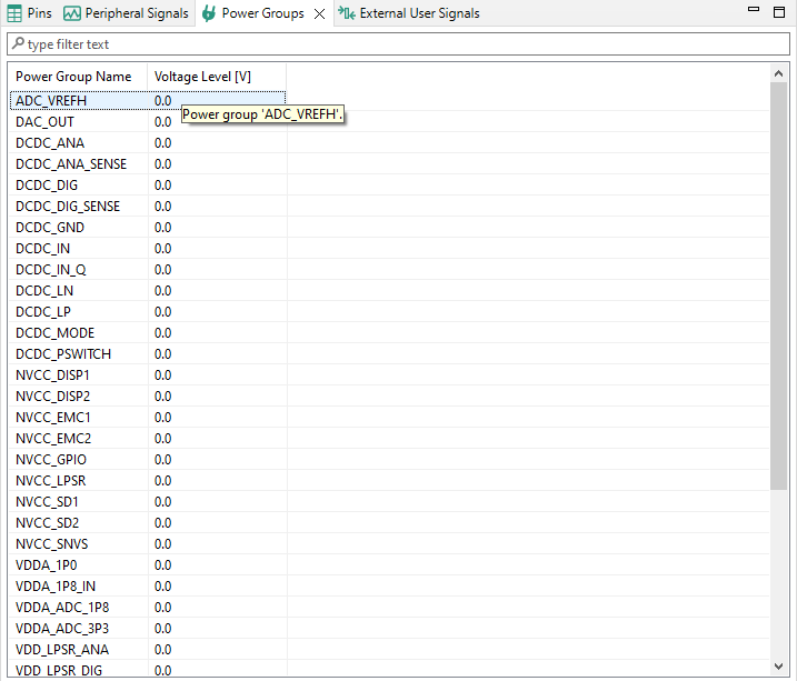 If your processor supports power groups, an additional tab will appear next to Pins and Peripheral Signals.