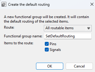If necessary, it is possible to create a new functional group that will route default signals to pins and internal signals. The functionality is available in Pins > Create Default Routing. There the user can select:
