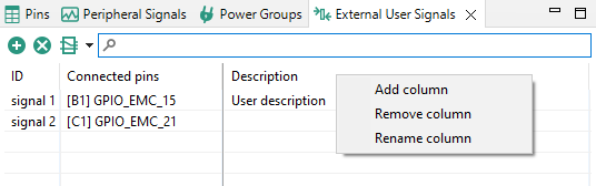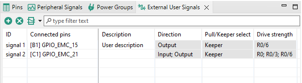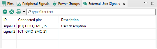 This view allows the user to define a custom description of the signals. An External User Signal has a defined unique ID within the table, pins to which it is connected, and any amount of additional text information. All of it can be customized.