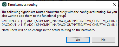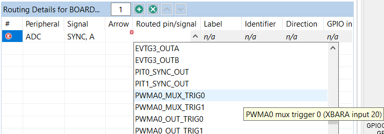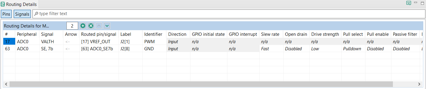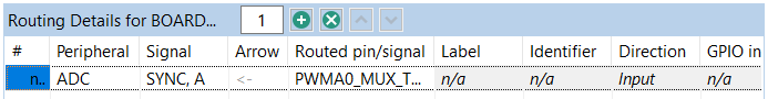 Note: It is necessary to select the ADC peripheral where the signal leads to (input in ADC). It is a limitation of the Pins tool that the signal is not listed for the PWM peripheral (output). Notice the direction of the signal in the Arrow column.