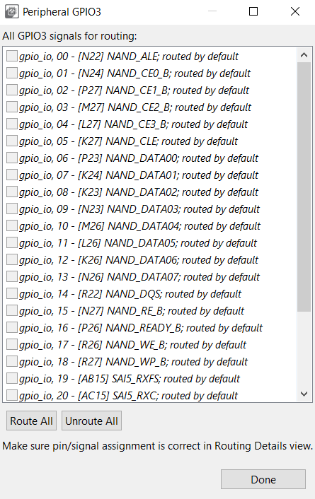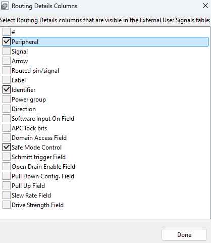 Tip: The option to route more signals to a single pin is indicated by an ellipsis (…). Select the cell to open a dialog to choose from multiple available signals. The dialog also displays which signals are routed by default.