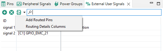 The button with the Routing Details view icon can be used to add routed pins to the table or to display columns from Routing Details view in the External User Signals view.