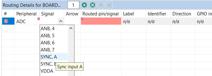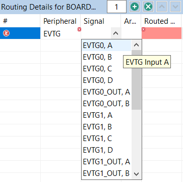 Select the output signal of peripheral A from the drop-down list in the Routed pin/signal column.