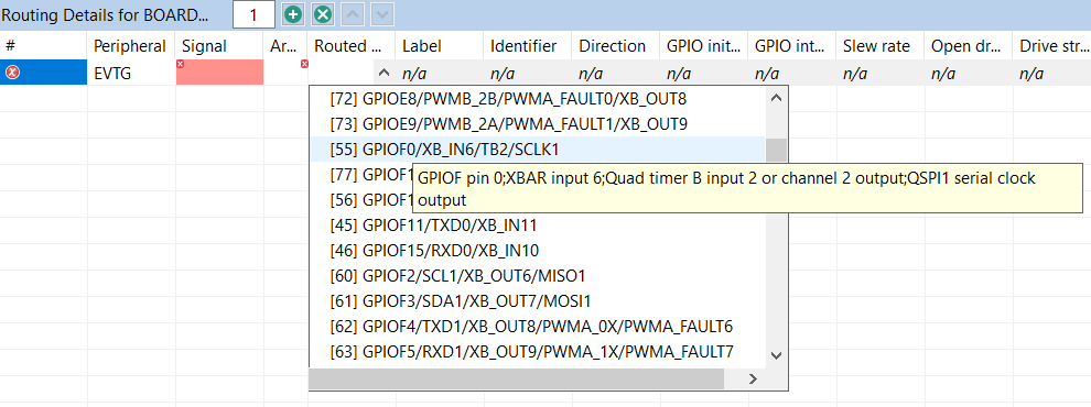 Note: In this example, GPIOF0 is multiplexed with XB_IN6, QTimerB channel 2 output/input and QSPI1 SCLK signal. In this case, the tool will automatically pick XB_IN6 for the pin as XB_IN6 is the only option to be routed to EVTG0 input A.