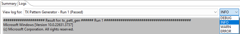 To start test execution, press the Start Validation button. Check the status of the running test from the Logsconsole. By default, the log level is set to INFO. Additional log level options are available with different output in the console:
