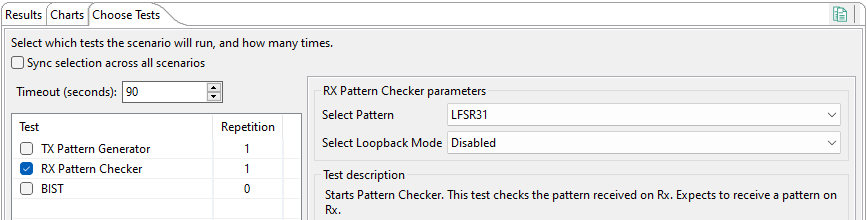 Once the SerDes configuration and board connection are set up, different Test scenarios can be executed. Each test can be customized by setting the parameters from Test options.