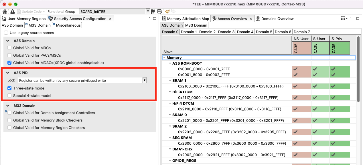 In the Trusted Execution Environment, or TEE tool, you can configure security policies of memory areas, bus masters, and peripherals, in order to isolate and safeguard sensitive areas of your application.