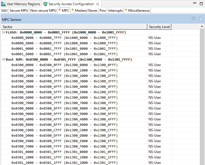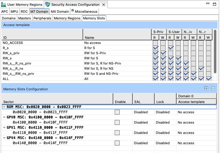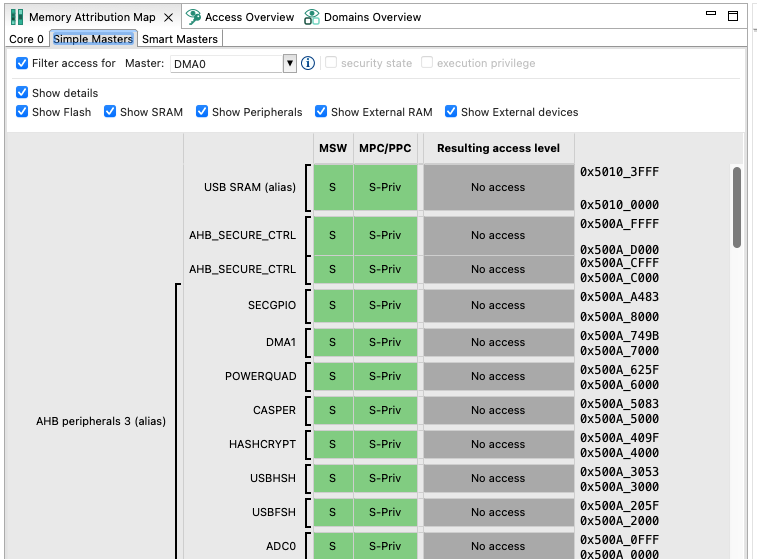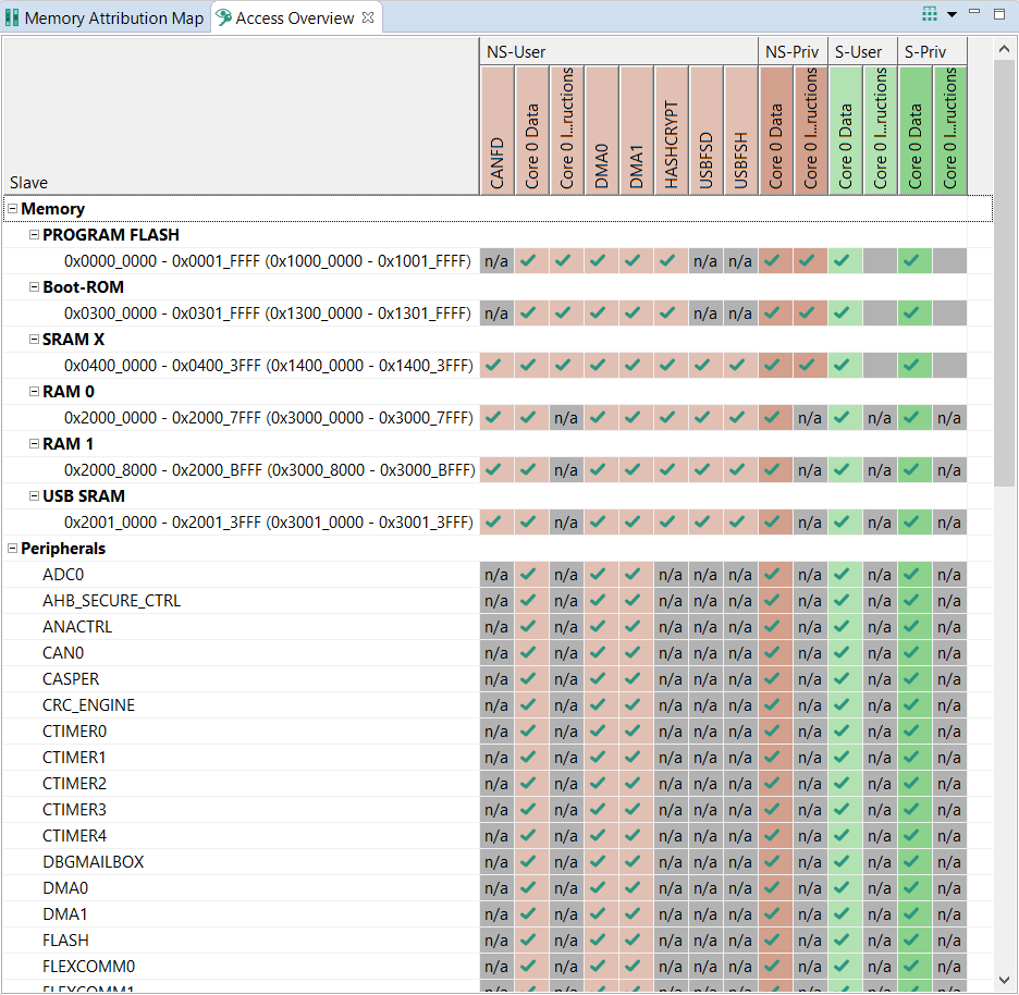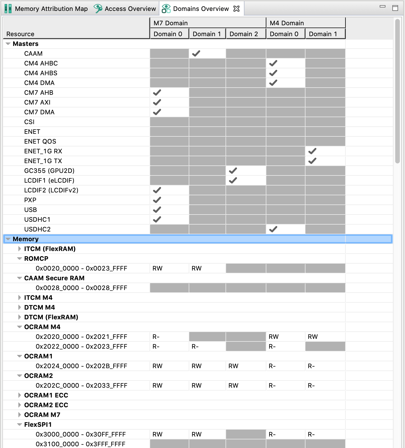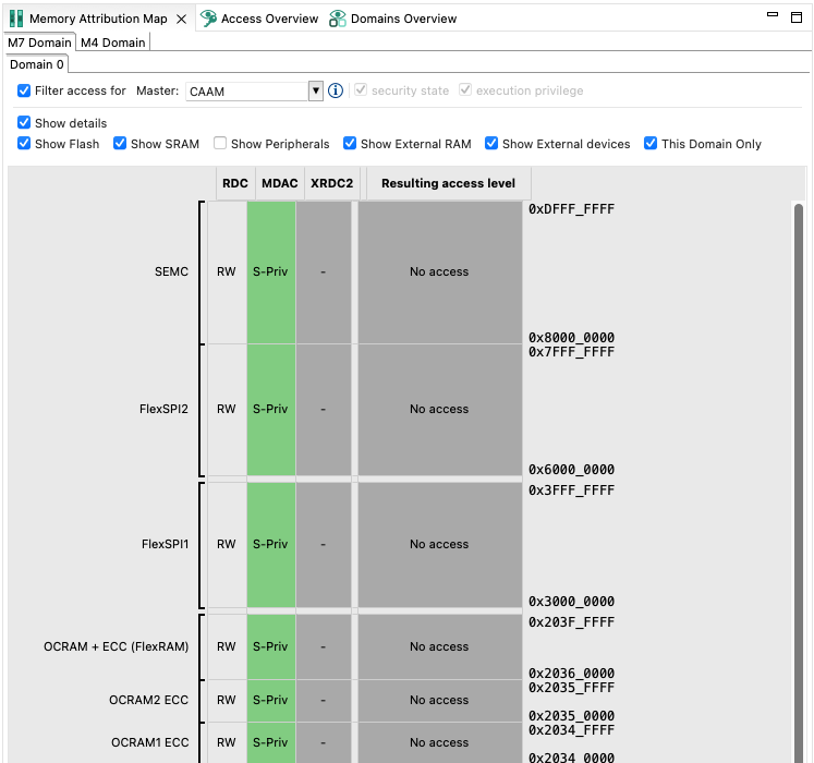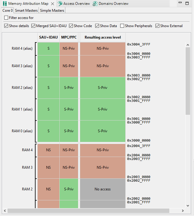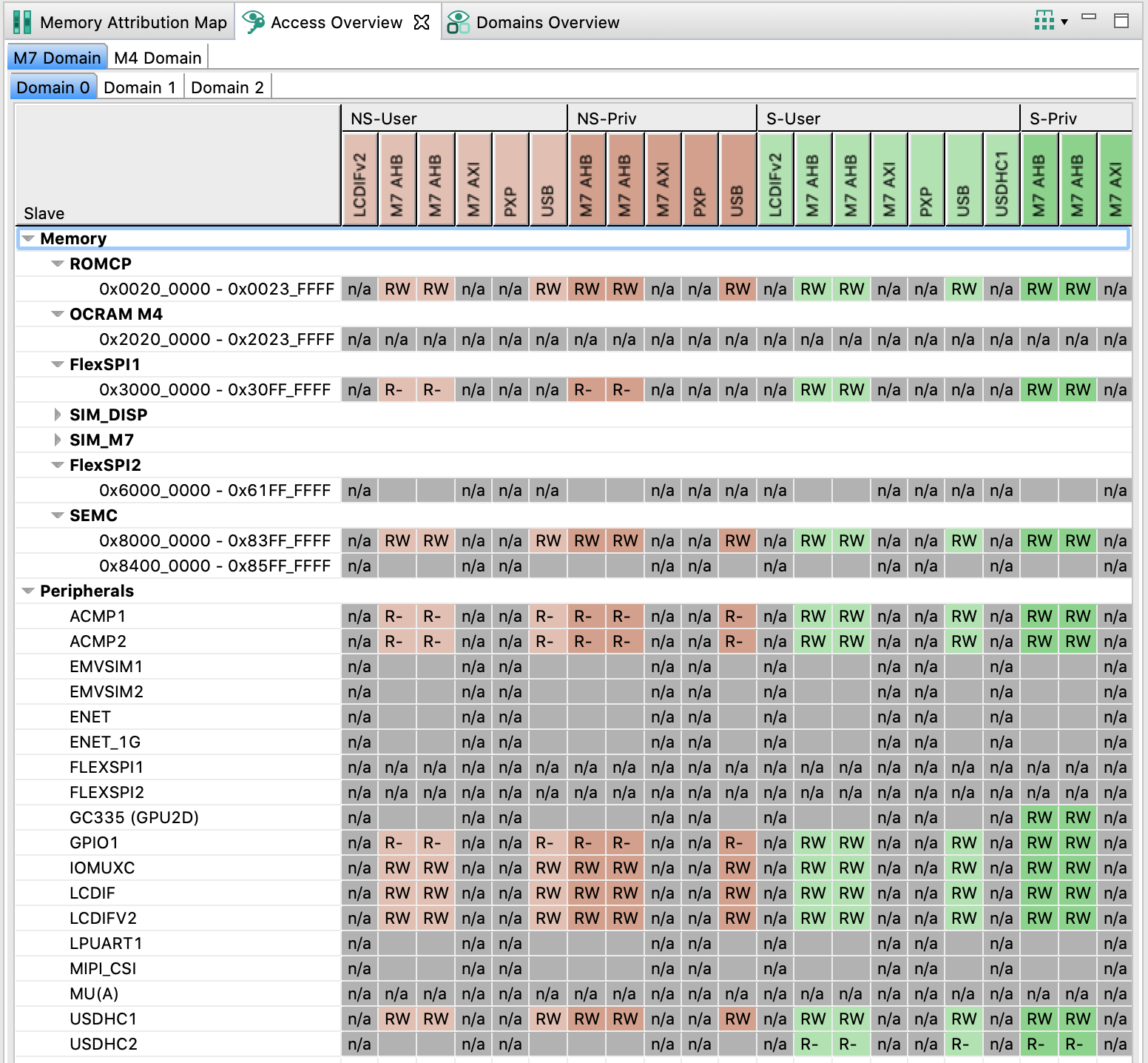 In the Memory Attribution Map view, you can review access levels set for all masters to the code, data, and peripherals memory regions on a domain level. The table is read-only.