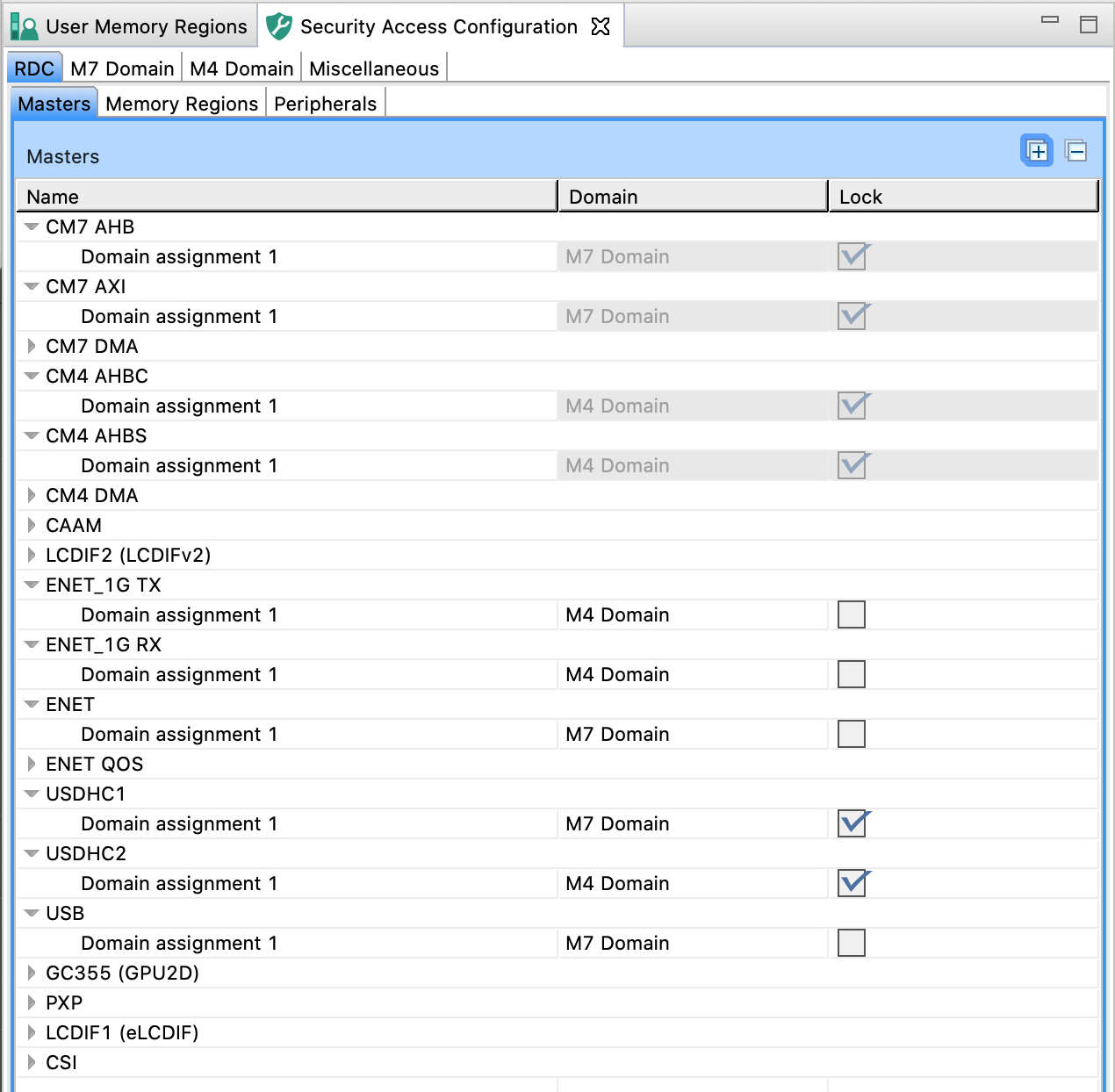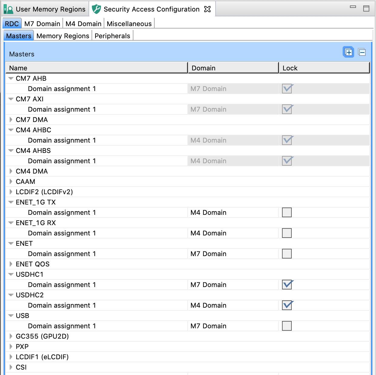 In the RDC Masters subview, you can view available bus masters, allocate them to available domains (cores), and lock/unlock the allocation.