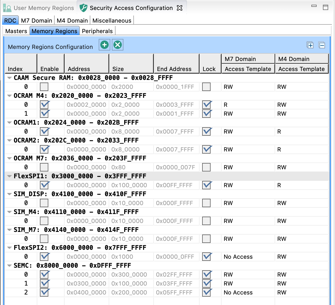 In the Memory Regions subview, you can view, enable/disable, and configure the MRC (Memory Region Controller) bus slaves and their domain access.