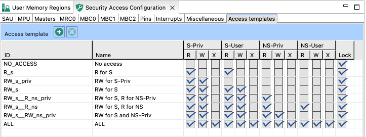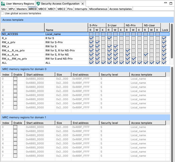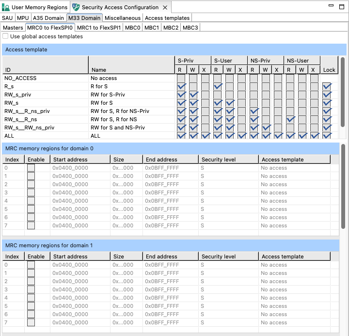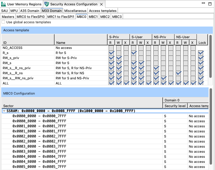Access templates are similar to patterns in XRDC2 on MIXRT117x. The main difference is as follows: you can switch between “global” (for the entire RDC, used by all checkers, and editable) and “local” (specific to the checker and immutable) templates; meanwhile access templates in XRDC2 are always validator-dependent and editable.