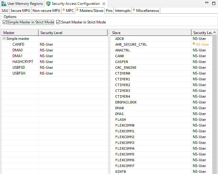 In the Masters/Slaves subview, you can configure security levels for bus masters and slaves.