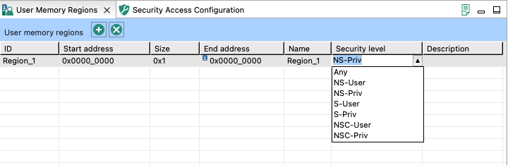 Enter/change the memory region’s parameters by clicking the row’s cells. In the Security Level column, you have these options to choose from: