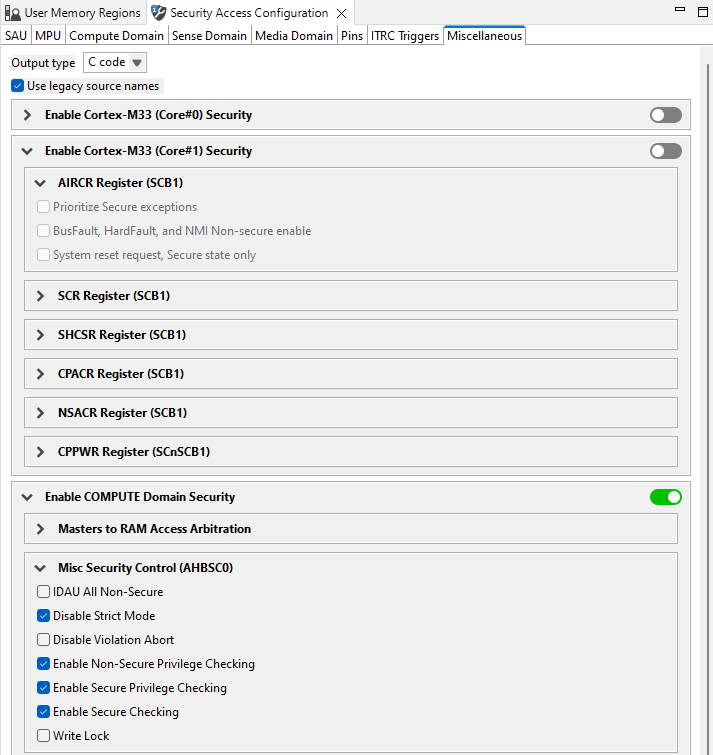 In the Miscellaneous subview, you can set various configuration options. The list of these options depends on processor data, and varies greatly. All the options influence your register settings, and can be inspected in the Register view. Only some of the options directly influence configuration that you have made in the Security Access Configuration view. Point your cursor over individual options to display a tooltip explaining the function of each option.
