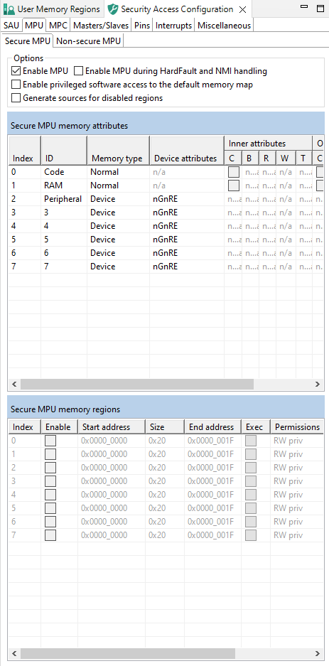 In the Secure MPU and Non-secure MPU sub-views, you can enable and configure MPU (Memory Protection Unit). You can create regions, specify their address, size, and other parameters. Use the Secure MPU sub-view for the configuration of the secure, and Non-secure MPU for the configuration of the non-secure security level.