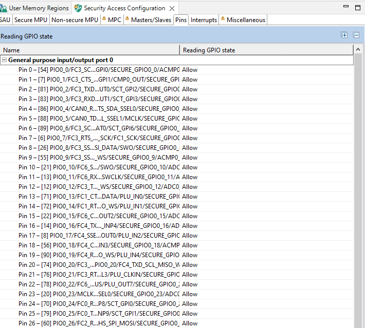 In the Pins subview, you can specify if the reading GPIO state is allowed or denied.