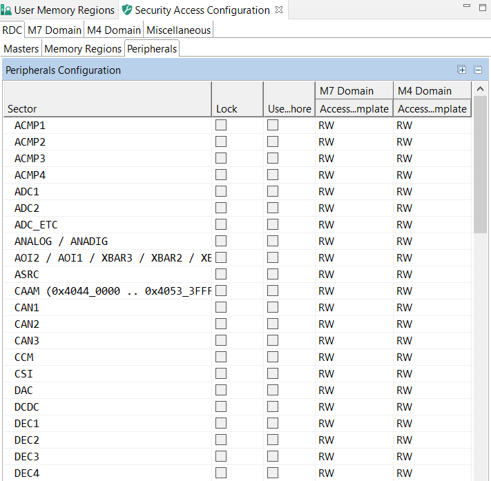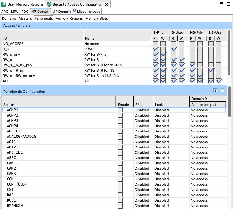 In the Peripherals subview, you can view the access templates for PAC (Peripheral Access Controller) and configure access for all peripherals managed by PAC on the selected RDC domain.