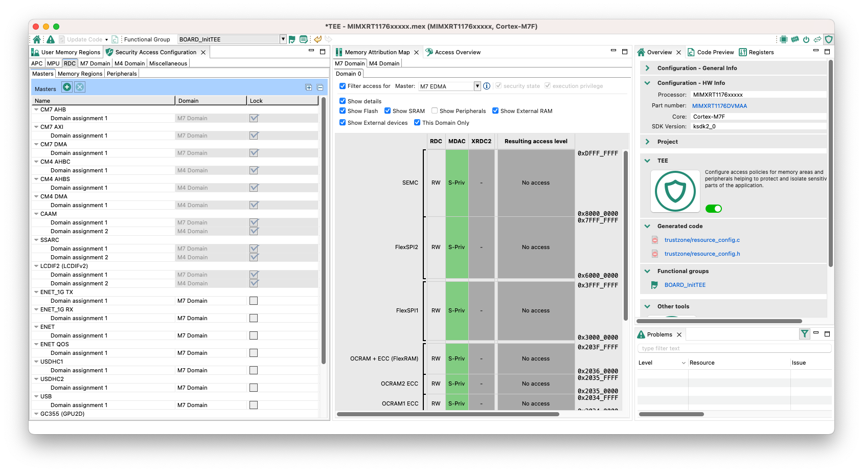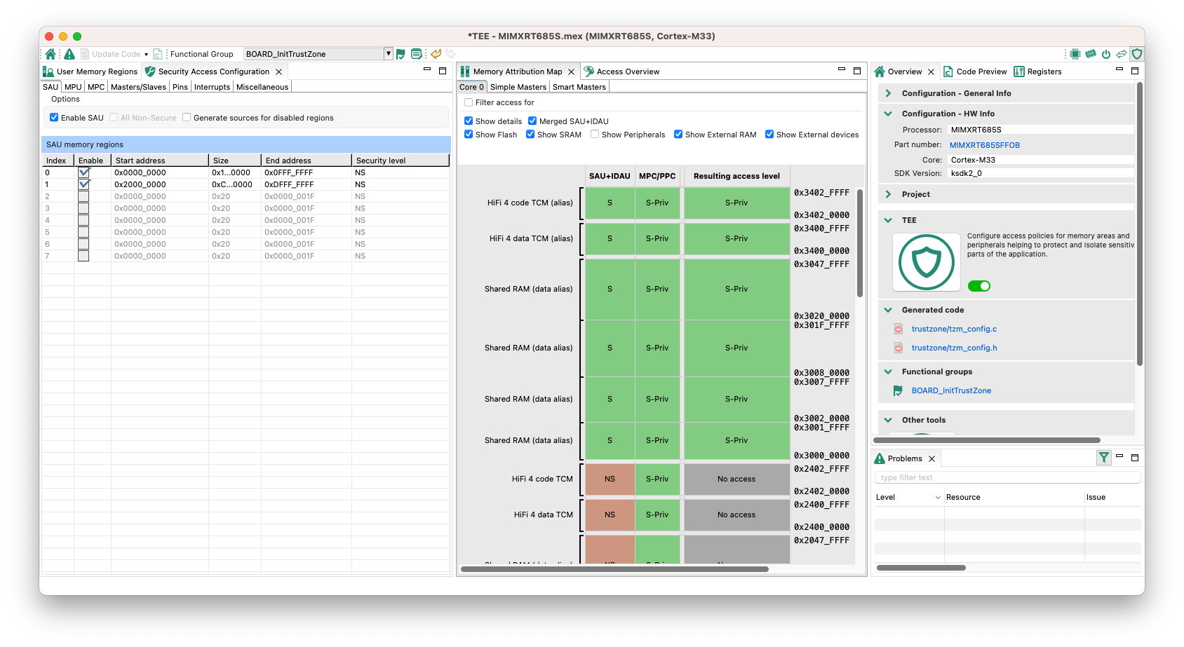 In the User Memory Regions view, you can create and maintain a high-level configuration of memory regions and their security levels. You can create the regions, name them, specify their address, size, security level, and provide them with a description. You can then fix any errors in the settings with the help of the Problems view.