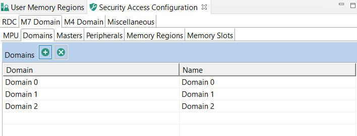 In the Domains subview, you can view, add/remove, and rename XRDC2 domains. Each CPU supports up to 16 XRDC2 domains.
