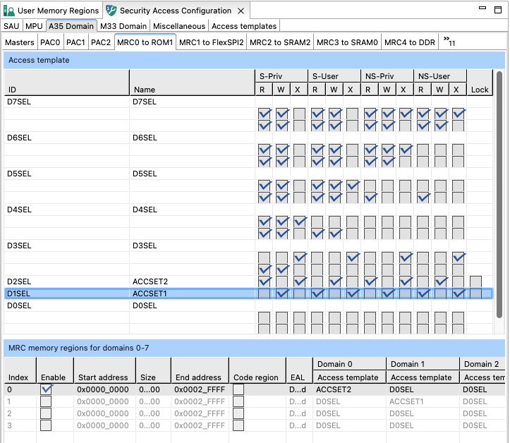 In the Memory Regions subview, you can view the access templates for MRC (Memory Region Controller) and configure access for all non-peripheral memory spaces managed by MRC on the selected RDC domain.