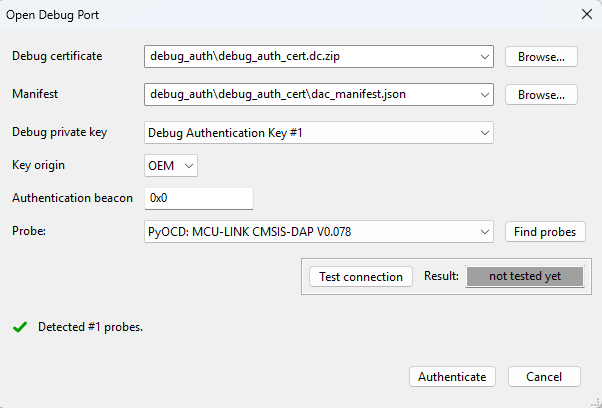After the certificate from OEM is received, click the Open debug port… button. The connected probes are detected upon the dialog display. The list of detected probes can be updated by clicking the Find probes button. Select one of the detected probes. The authentication beacon is an optional parameter and it is independent of the credential beacon provided by the OEM. It is not interpreted by the debug authentication protocol, it is passed to the debugged application.