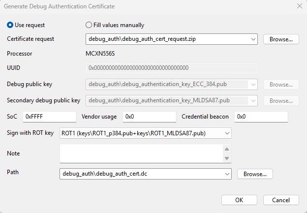 The certificate is by default generated into <workspace>/debug_authfolder, debug_auth_cert.dc. A *.zip archive with the same name is created, it contains the certificate and the .txt file note from OEM. For devices that support the dual key schema, the created ZIP file also contains a manifest with additional information for DA configuration and public keys. The note that is passed from field technician to OEM is displayed in the note field (see Figure “Generation of debug certificate from certificate request”).